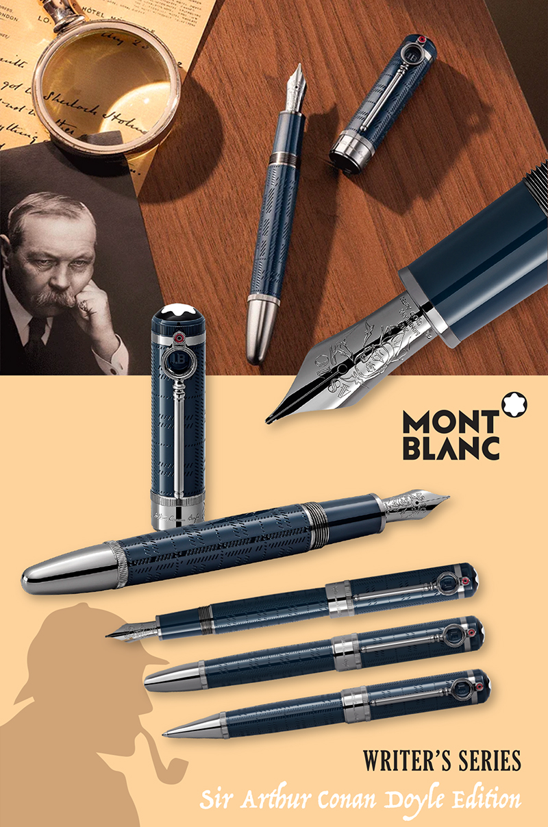 The Montblanc Writers Edition Sir Arthur Conan Doyle Limited Edition, is dedicated to one of the most renowned crime novelists and originator of the famous consulting detective Sherlock Holmes. Made from blue-grey precious resin, the edition evokes the sinister, foggy atmosphere of London, where Sherlock Holmes usually solves his cases. The cap and barrel of this edition are decorated with a plaid pattern in reference to Holmes’ coat, as well as parts of a historic London city map. The initials JB are found beneath the PVD-coated, magnifying glass-shaped clip in an homage to Joseph Bell: the very real man behind the Sherlock Holmes character. The Montblanc Emblem in precious resin crowns the cap of the edition. The handcrafted Au 750 solid gold nib is engraved depicting flying dinosaurs from “The Lost World” around the portrait of the father of “Professor Challenger” and “Sherlock Holmes”.