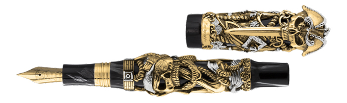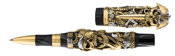 Among the limited edition series produced by Montegrappa is the Cult Collection, honouring individuals, artists and elements of popular culture. It is with a sense of both delight and mischief that the craftsmen and women at Montegrappa present to you the writing instruments commemorating those swashbuckling adventurers who terrorised those who traversed the Caribbean during the 16th through to the 19th centuries – and who, to this day, provide us with legendary exploits and larger-than-life figures to entertain us in books and films. Offered as piston-fed fountain and rollerball pens, the Pirates writing instrument is made in Charcoal Black celluloid and a die-cast precious metal barrel and cap. This impressive masterpiece has been produced in both Sterling Silver with yellow gold details, and solid 18k yellow gold, embellished with an array of symbols that have defined the buccaneer for six centuries.