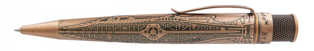 Journey to undiscovered depths... with Retro51’s newest addition to the Literary Collection, The Nautilus. The mystery of the sea awaits with this new Big Shot Tornado Rollerball intricately designed after the legendary Nautilus submarine from Jules Verne’s timeless masterpiece 20,000 Leagues Under the Sea. In the words of Captain Nemo, “The ocean is an immense desert where man is never alone, for he can feel life bustling all about him.” That bustling life begins on the packaging tube, decorated with foil stamped graphics reminiscent of a vintage book cover. Excitement continues when you open the tube with a POP to reveal the metal pen inside. Experience the weight, textured rivets, panels and details of the submarine acid-etched in the barrel and finished with stonewashed copper; this pen exudes an aura of adventure, just like the enigmatic vessel.